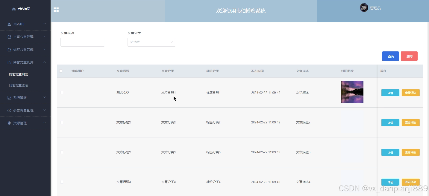 博客文章管理:管理员在博客列表页面可查看博客用户发布的博客文章信息,可对博客文章进行详情和管理博客用户的评论,如图4-13所示。