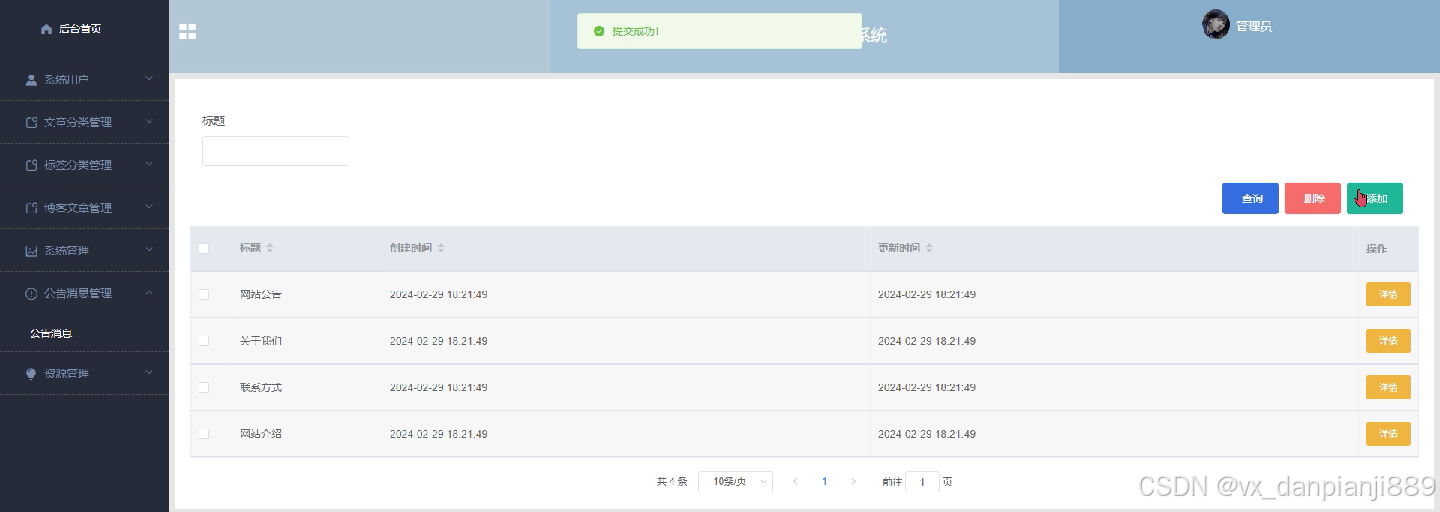 公告消息管理界面逻辑代码如下: