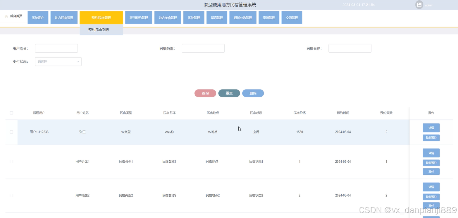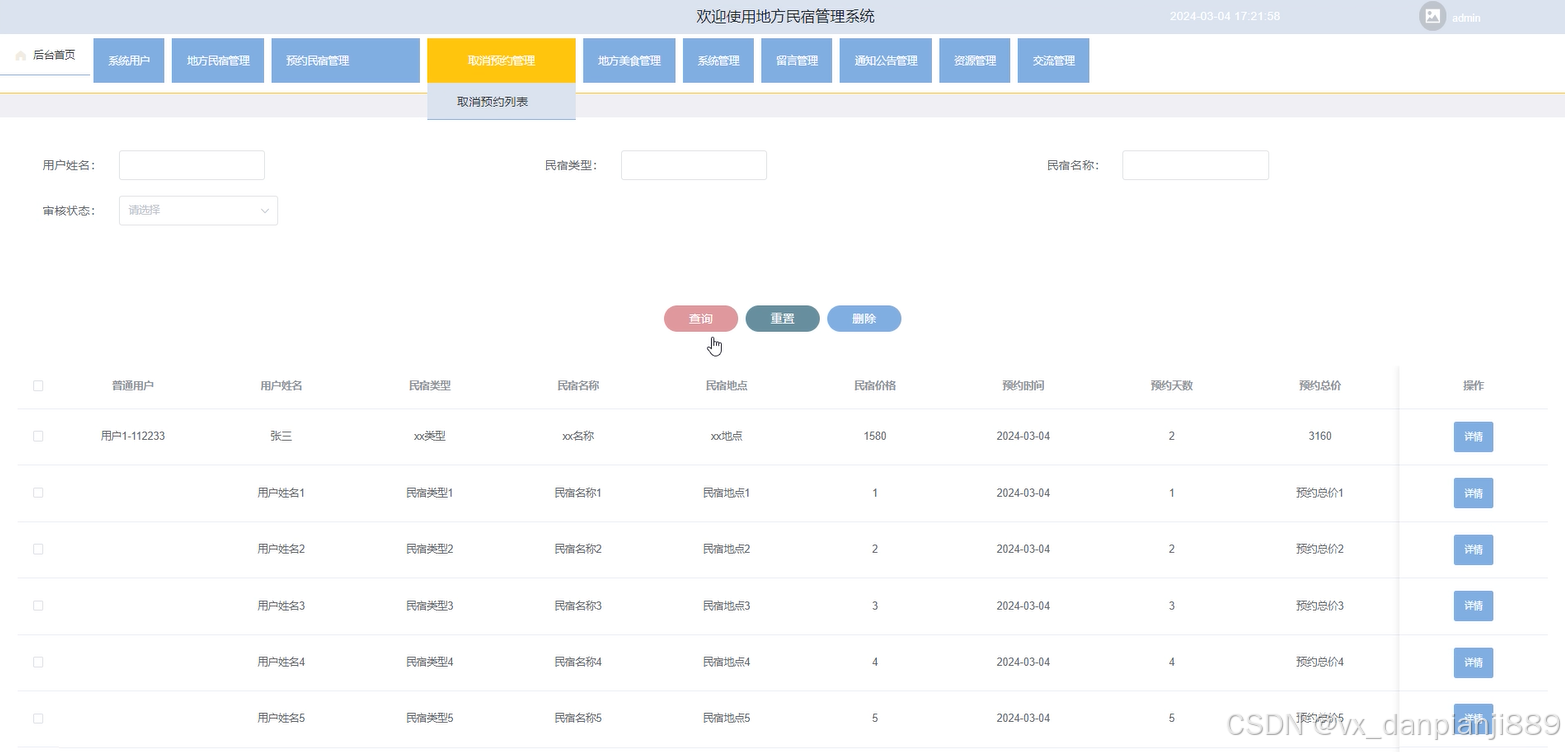 (5)预约民宿管理:管理员点击“预约民宿”菜单可以对预约民宿进行管控。