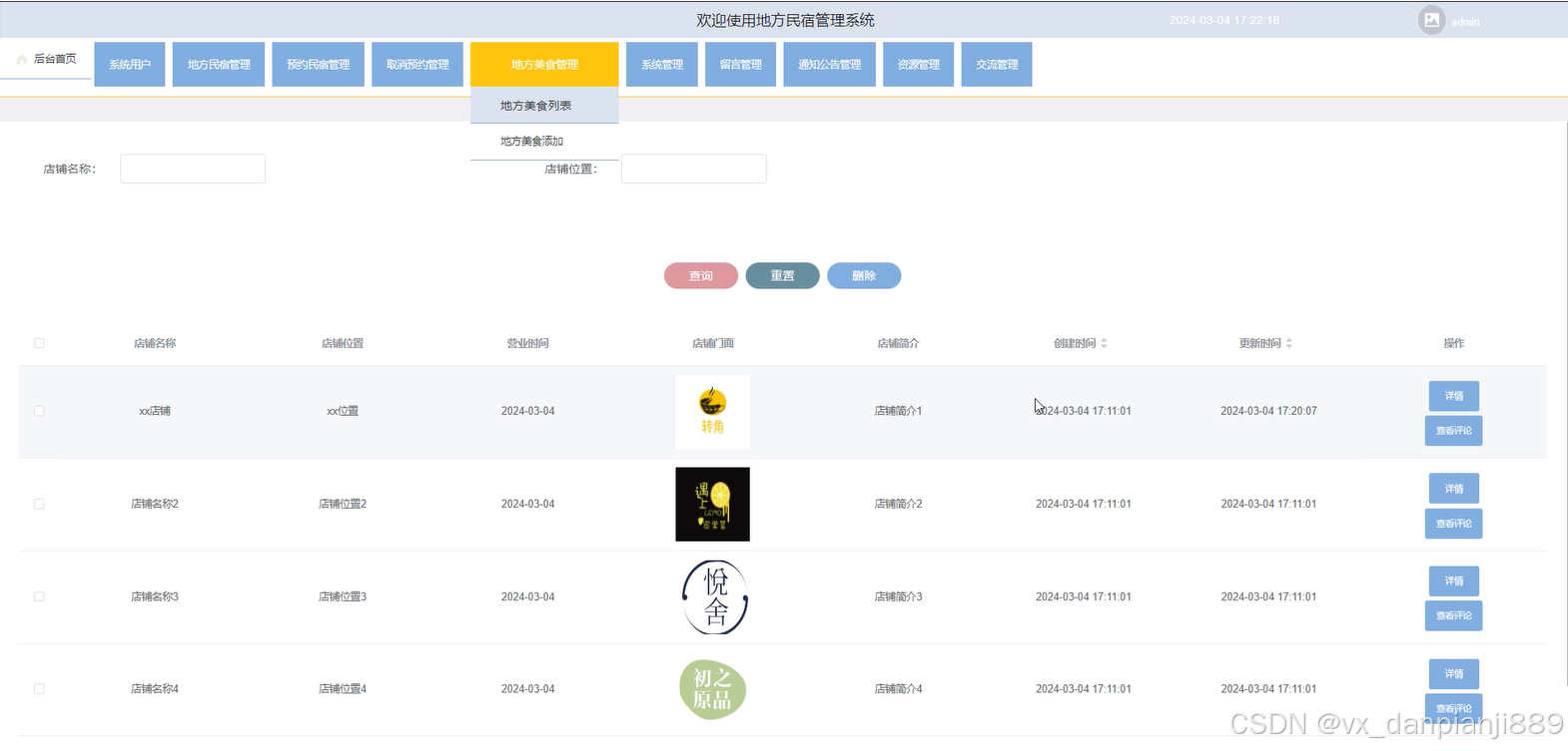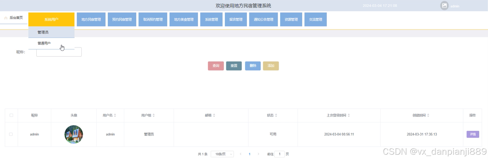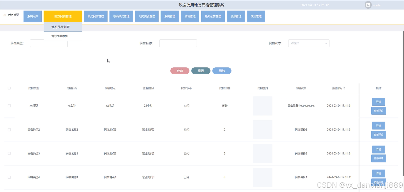 (4)地方民宿管理:管理员可以对地方民宿进行增删改查。