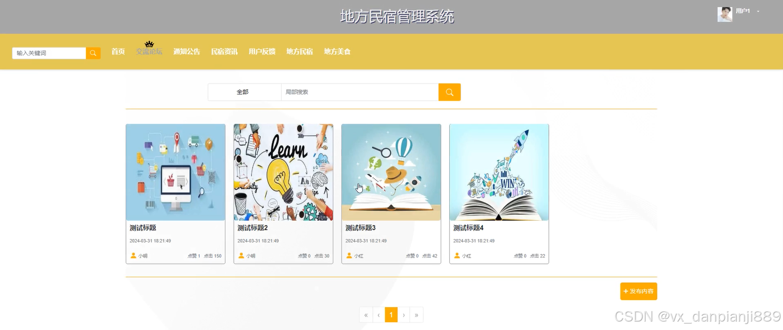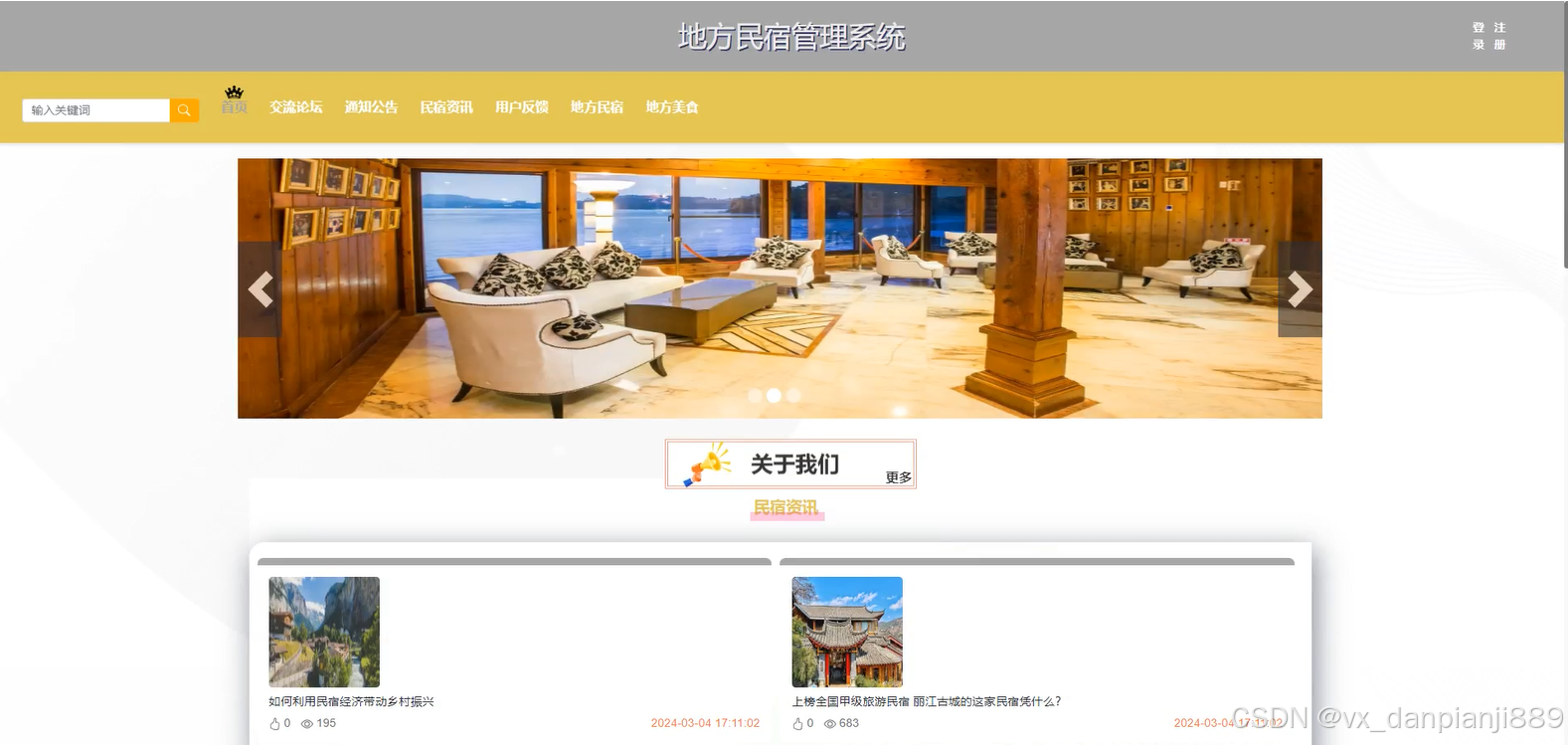 (2)查看地方民宿管理系统的首页信息:地方民宿管理系统的首页信息包含了首页、交流论坛、通知公告、民宿资讯、用户反馈、地方民宿、地方美食等。