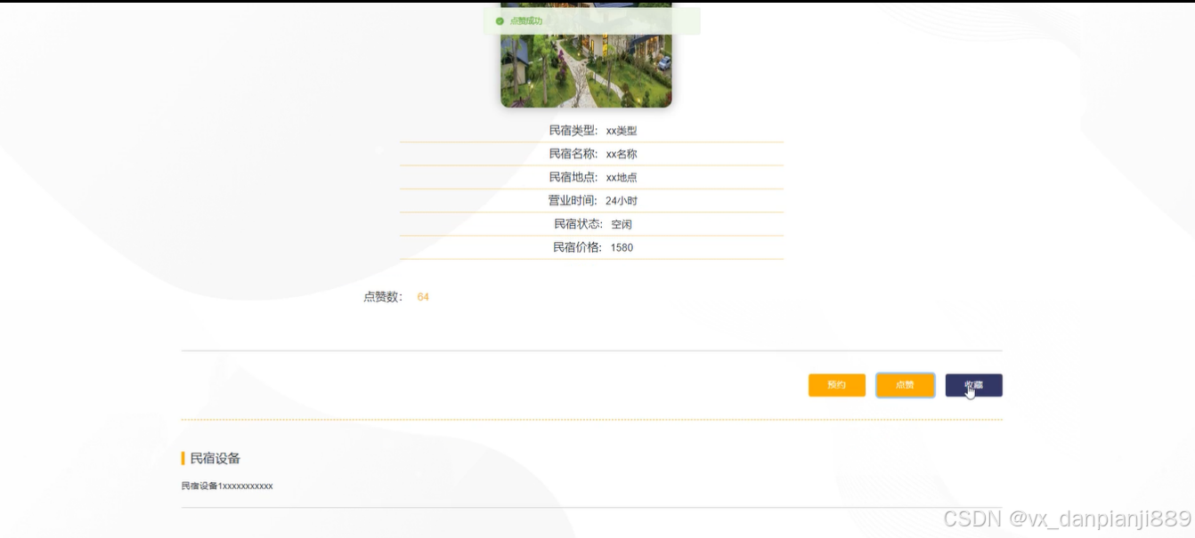 (6)地方民宿:当用户点击“地方民宿”这一菜单按钮,会显示管理员在后台发布的所有的地方民宿,支持通过关键词对地方民宿进行搜索,选择需要的地方民宿点击可以进入到地方民宿详细的介绍界面,在详细界面可以查看到民宿的民宿类型、民宿名称、民宿地点、营业时间等信息,同时可以进行预约、点赞、收藏、评论操作;