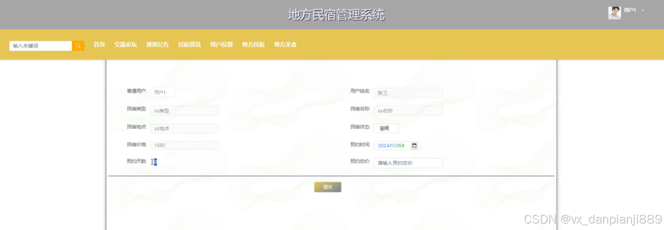 (7)预约:当用户在地方民宿详情界面想要进行预约,点击下方的“预约”按钮,就会跳转到预约信息填写界面,根据界面提示输入预约信息,点击“提交”按钮,预约就完成了;