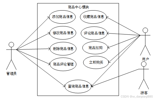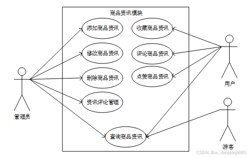 (2)商品资讯模块:游客可以查看商品资讯,用户可以收藏、评论、点赞商品资讯信息,管理员可以添加、修改、删除商品资讯,管理评论。商品资讯模块用例如下图2-2所示。