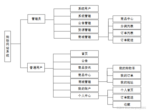 本购物网站系统的设计主要是针对三种用户进行使用,第一种是以游客身份使用,游客在进入系统后可以查看到系统中的所有内容,包括首页、公告、商品资讯、商品中心、商城管理,如果想要评论或者购买,可以注册登录;第二种是注册之后有账号的用户,登录以后可以收藏、评论、购买、管理收货地址、订单、个人资料等;第三种则是管理员,是系统的管理者,管理员对系统中的系统用户、系统管理、公告管理、资源管理、商城管理进行整体把控。