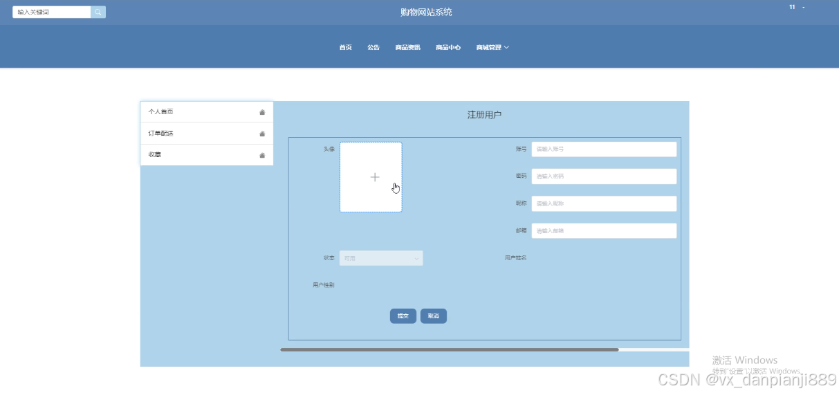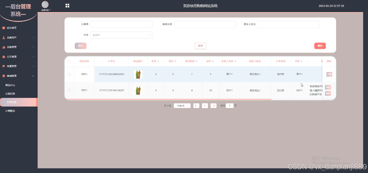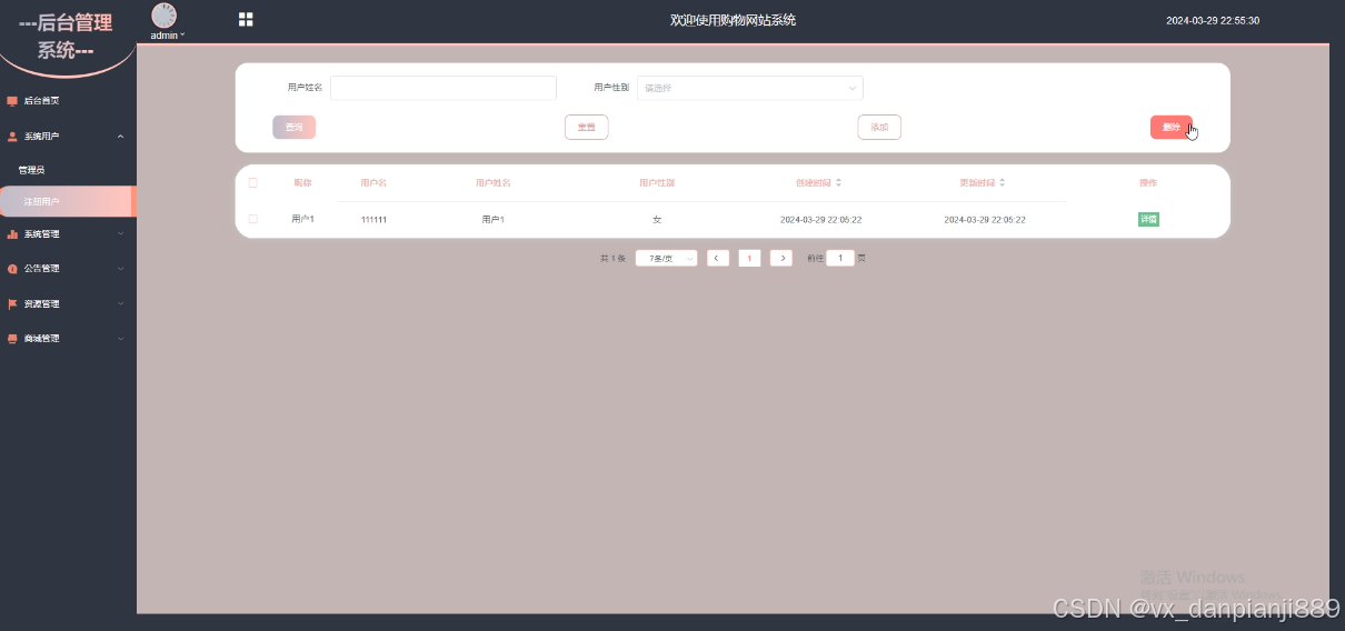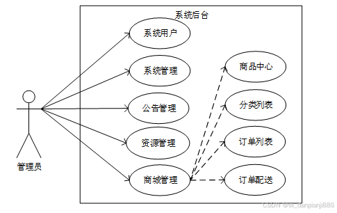 用户不能进入后台,管理员进入以后可以对系统用户、系统管理、公告管理、资源管理、商城管理 (商品中心、分类列表、订单列表、订单配送)进行管理。