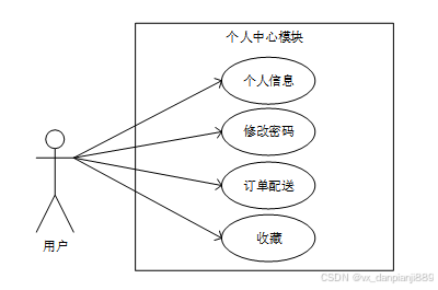 (7)个人中心模块:个人中心模块是用户独有的功能,可以在“我的账户”管理个人资料,密码修改,也可以在“个人中心”对个人首页、订单配送、收藏进行管理,用例如下图2-7所示。