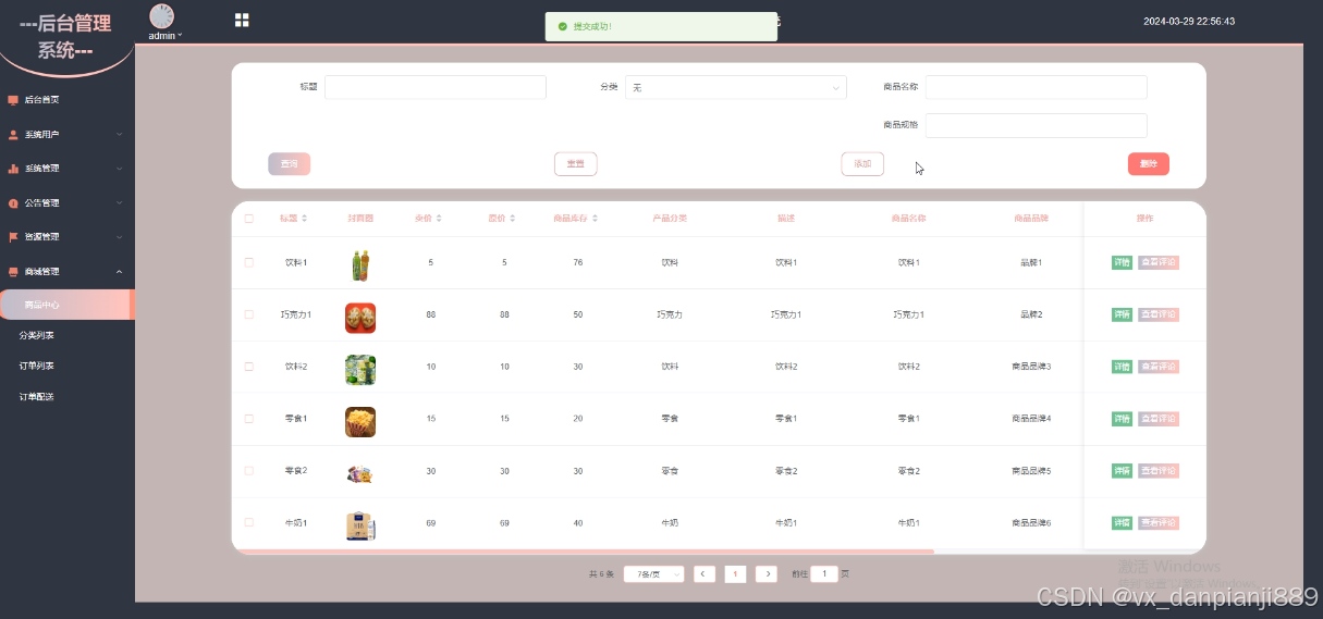 管理员拥有对商城管理中的商品中心商品进行添加、修改、删除、管理评论的功能,商品中心管理界面如下图4-15所示。