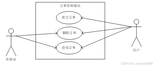 (6)订单管理模块:订单管理模块是前台用户和后台管理员都有的功能,前台用户可以提交订单,管理订单,管理员能够对用户订单进行管控。订单管理模块用例如下图2-6所示。