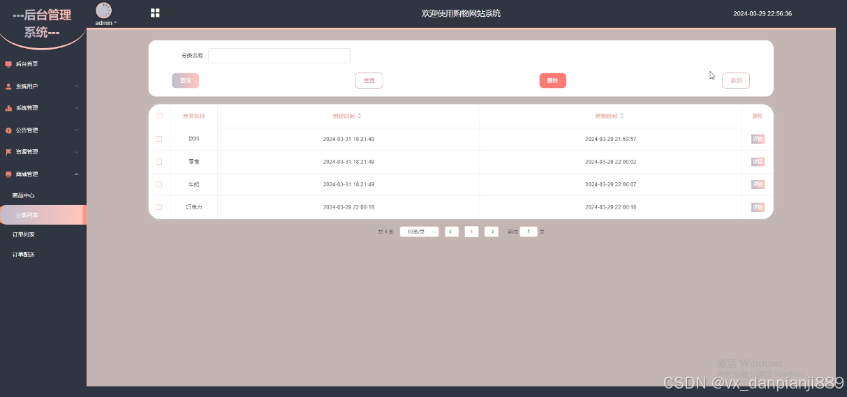 管理员拥有对商品的分类增删改查的功能,分类列表界面如下图4-16所示。