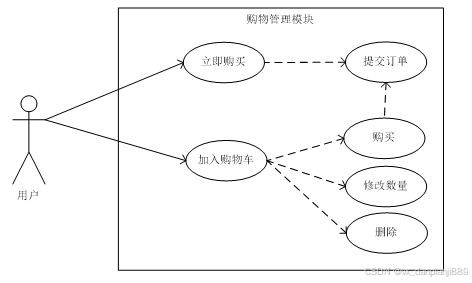 (5)购物管理模块:购物管理是前台用户独有功能,用户可以选择两种购买方式,一种是把商品加入到购物车,另一种是直接购买,最终实现购物功能,购物管理模块用例如下图2-5所示。