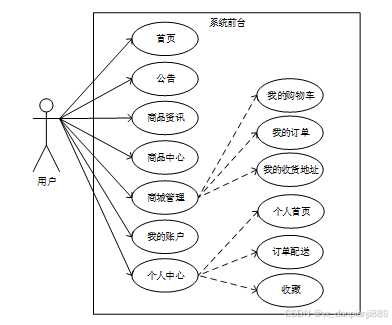 购物网站系统的前端主要是对系统信息的查看、收藏、评论以及对商品的购买,购买的过程中需要对收货地址进行设置,对购物车进行管理,查看自己的订单。前台普通用户用例图如图2-8所示。