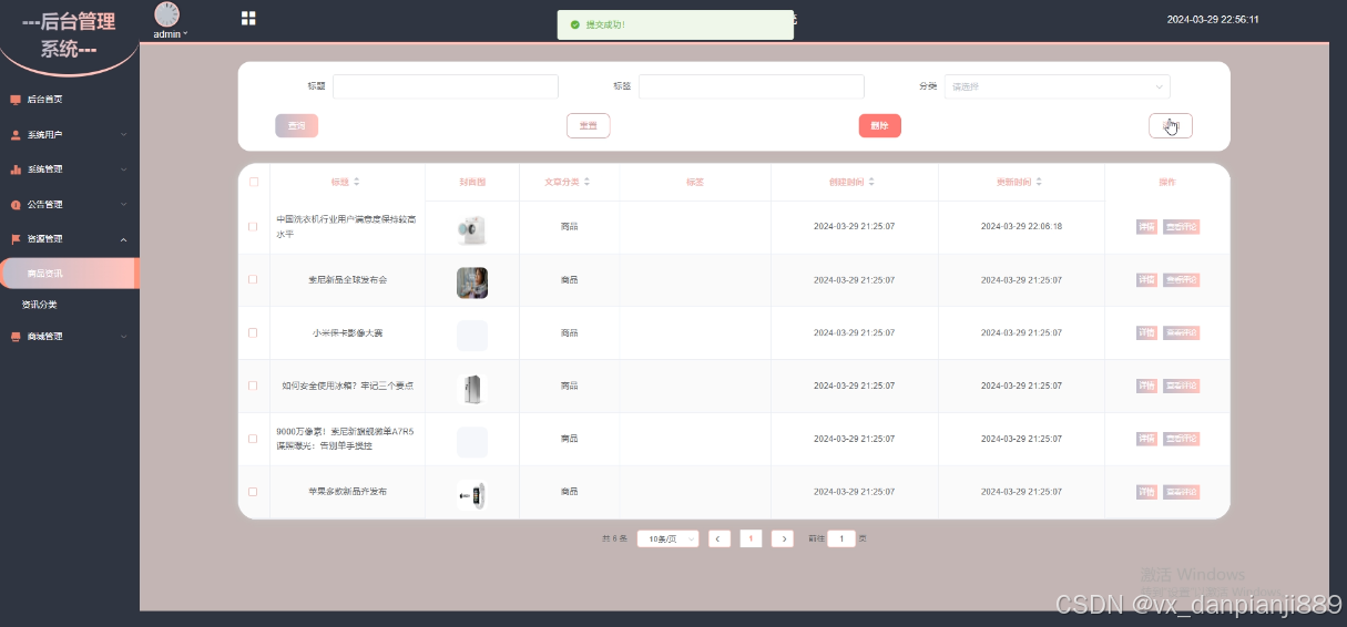 管理员点击“资源管理”可以对前台展示的商品资讯以及资讯所属分类进行管理,商品资讯管理的界面如下图4-14所示。