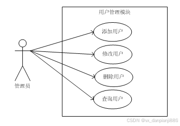 (4)用户管理模块:用户管理是后台管理员独有功能,管理员可以对注册的用户进行修改、删除、查询、也可以添加新的用户。用户管理模块用例如下图2-4所示。