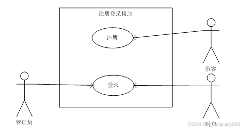 (1)注册登录模块:注册是游客独有的功能,注册后就成了系统的正式用户了,然后用户通过前台登录,管理员用户通过后台登录。注册登录模块用例如下图2-1所示。
