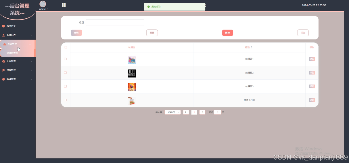 购物网站系统中的管理人员在“系统管理”这一菜单下是可以对购物网站系统内展示的轮播图进行添加修改的。系统管理界面如下图4-13所示。