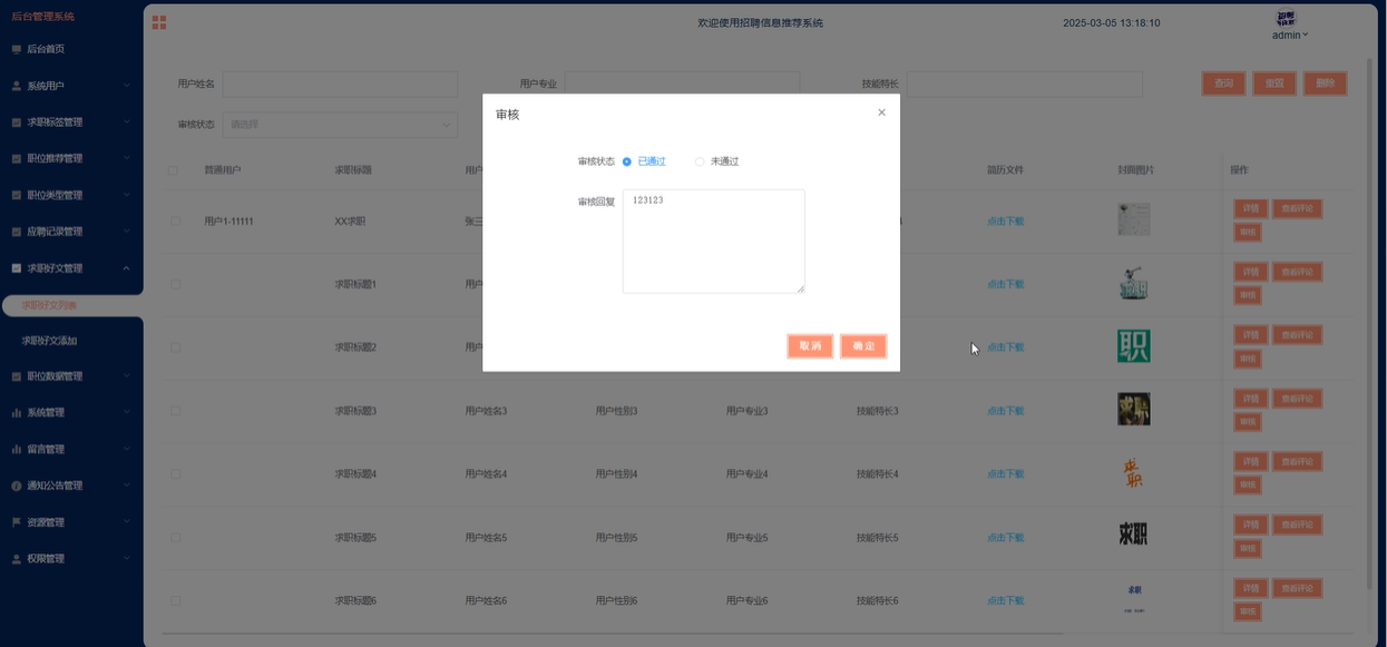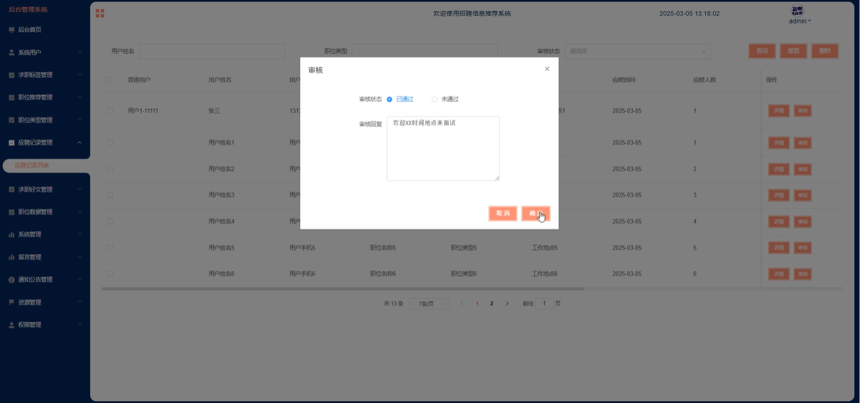应聘记录管理:管理员可以查看所有用户的应聘记录,包括审核和管理用户投递的简历。管理员可以对每条应聘记录进行搜索、查询、重置、删除等操作。