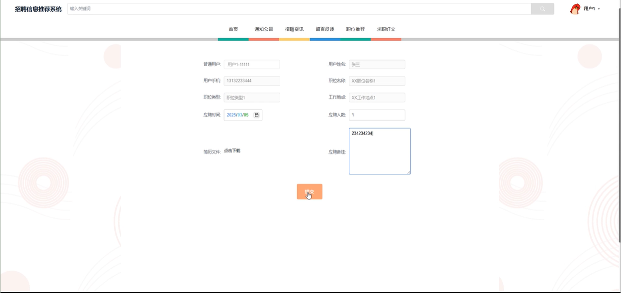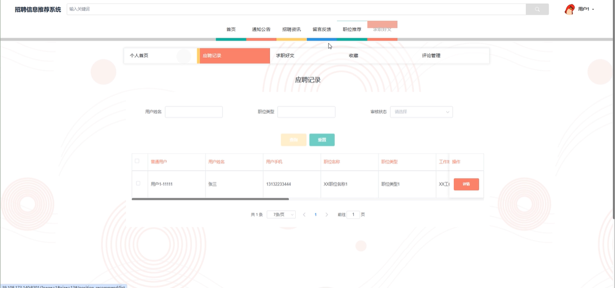 应聘记录:用户可以查看自己投递简历的记录,查询审核状态、查看是否通过等,并下载简历文件。用户可以对每条应聘记录进行搜索、查询、重置等操作。