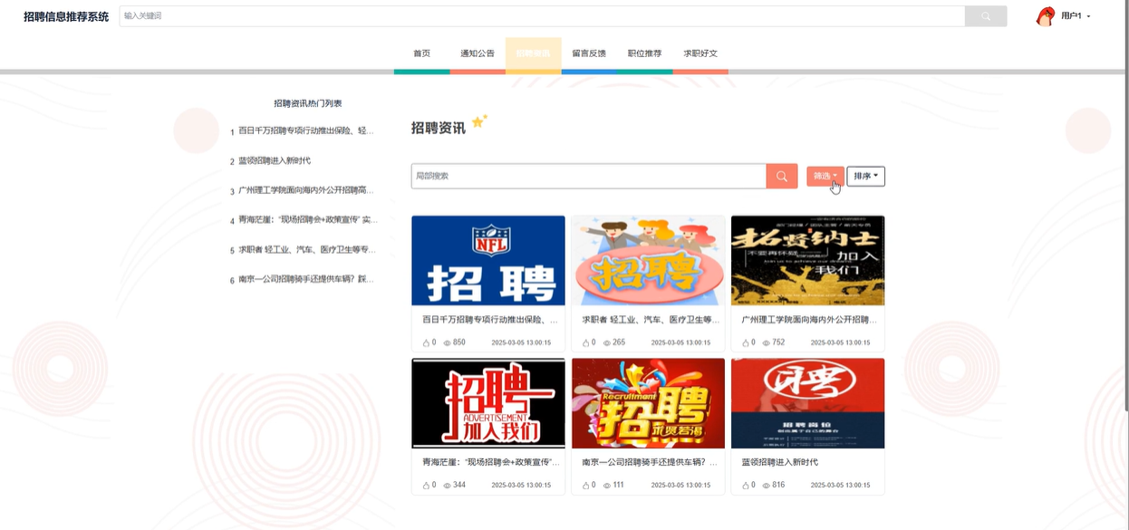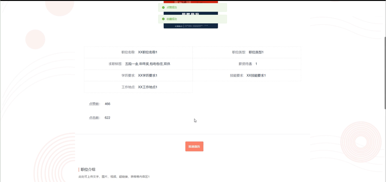 资源管理:管理员可以管理招聘资讯和资讯分类,包括查看、修改、删除、添加等操作。管理员可通过这一功能优化网站的资源分类,提升用户体验。