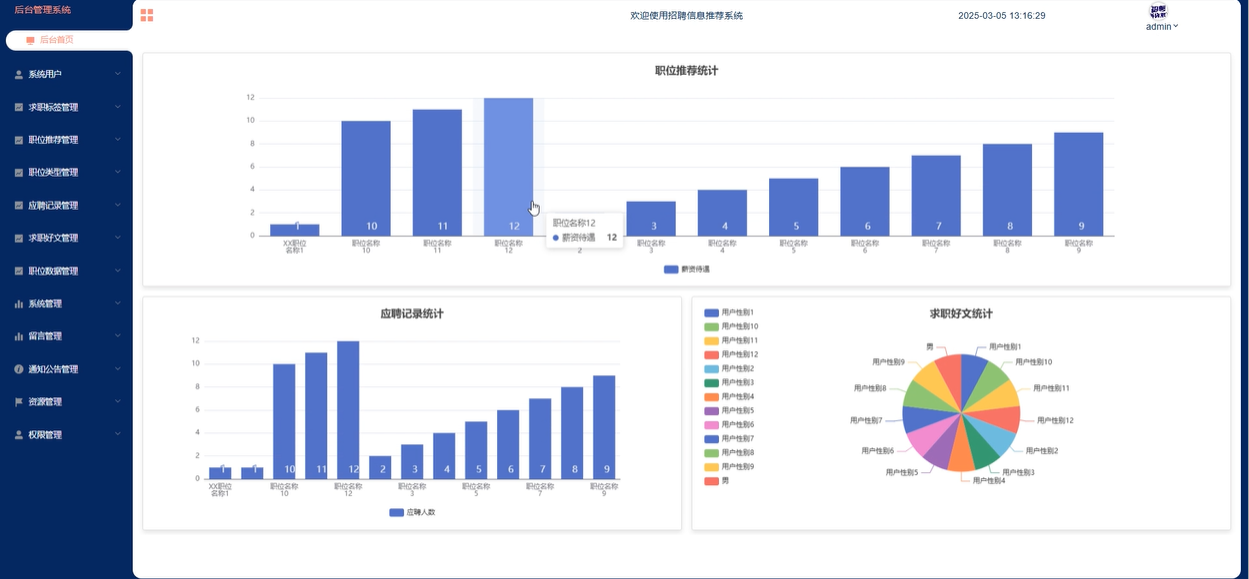 后台首页:管理员可以通过后台首页查看职位推荐统计、应聘记录统计、求职好文统计等数据,通过折线图和圆形图等形式展示关键指标。管理员可以根据这些数据作出业务调整,同时也可以修改个人资料和密码。