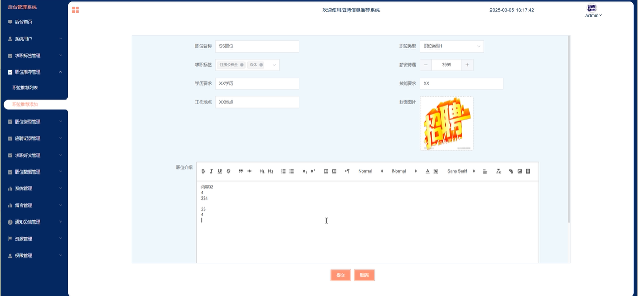 职位推荐管理:管理员可以查看职位推荐的详细信息,包括职位内容、评论、推荐状态等。管理员可以对职位进行添加、修改、查询、删除等操作,确保职位信息的准确性和完整性。