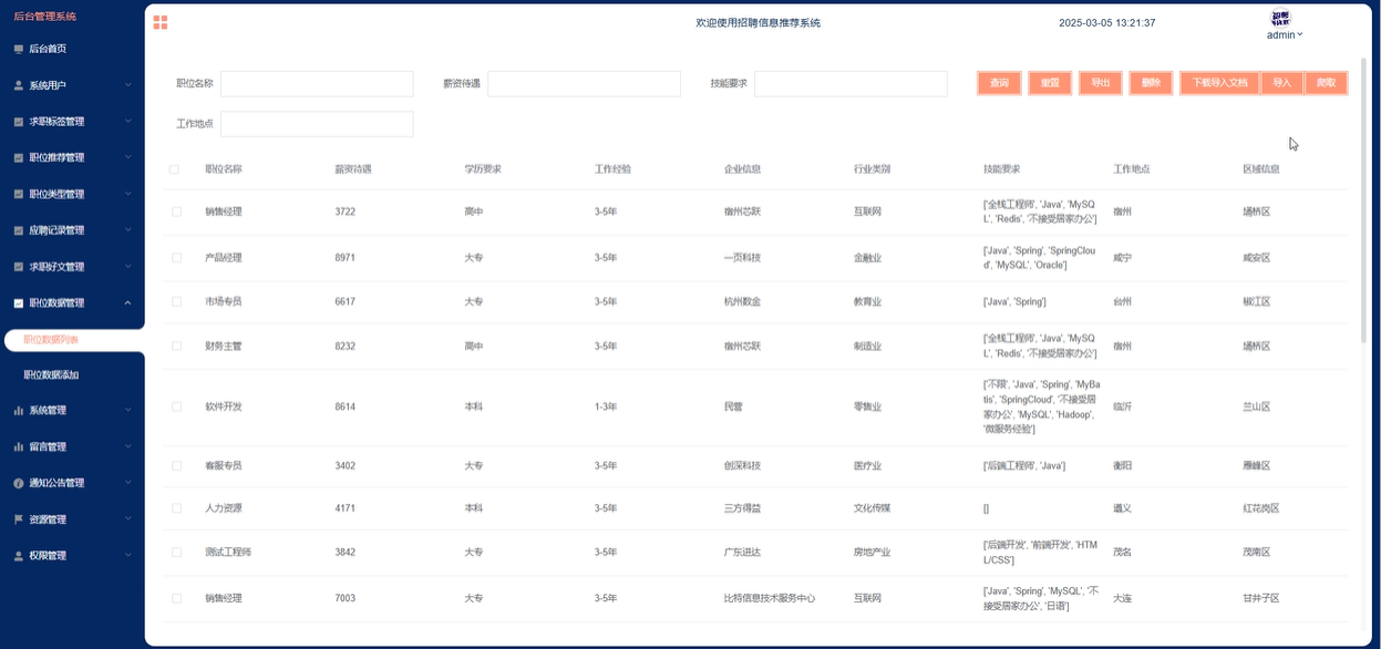 管理员可以查看和管理职位数据,包括职位详情、添加职位、删除职位等。管理员可以导出职位数据,下载导入文档,还支持通过爬虫技术一次性爬取多个招聘数据,极大地提高招聘信息的更新速度。模块如下图所示。