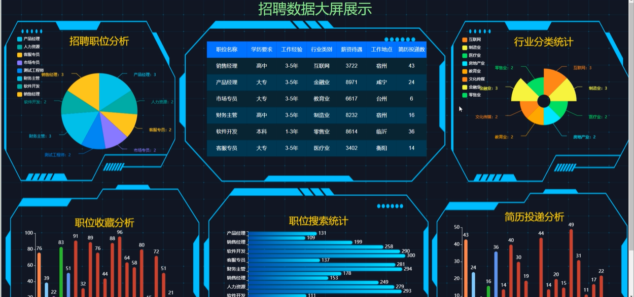 管理员可以通过可视化大屏展示招聘数据,包括职位推荐分析、行业分类统计、职位收藏分析、职位搜索统计、简历投递分析等。管理员可以通过这些数据分析,调整招聘策略,提高招聘效果。模块如下图所示。
