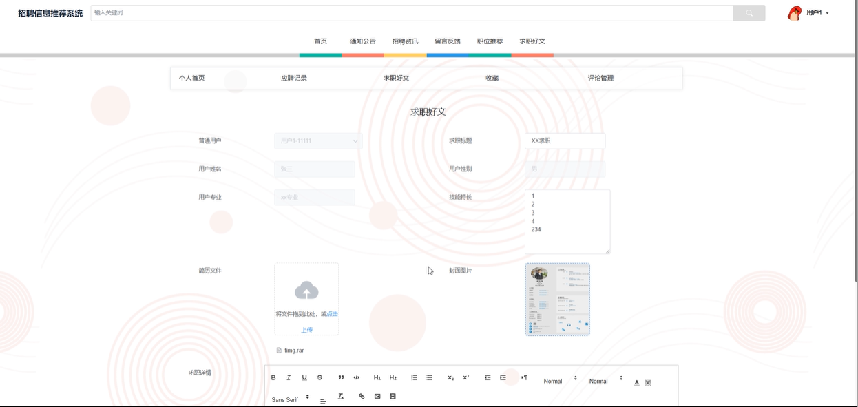 用户可以浏览求职相关的文章和资源,查看文章的详细内容,并根据自己的专业背景进行筛选。用户可以下载简历文件、点赞、收藏、评论或回复这些文章,提升自己的求职技巧和准备。模块如下图所示。