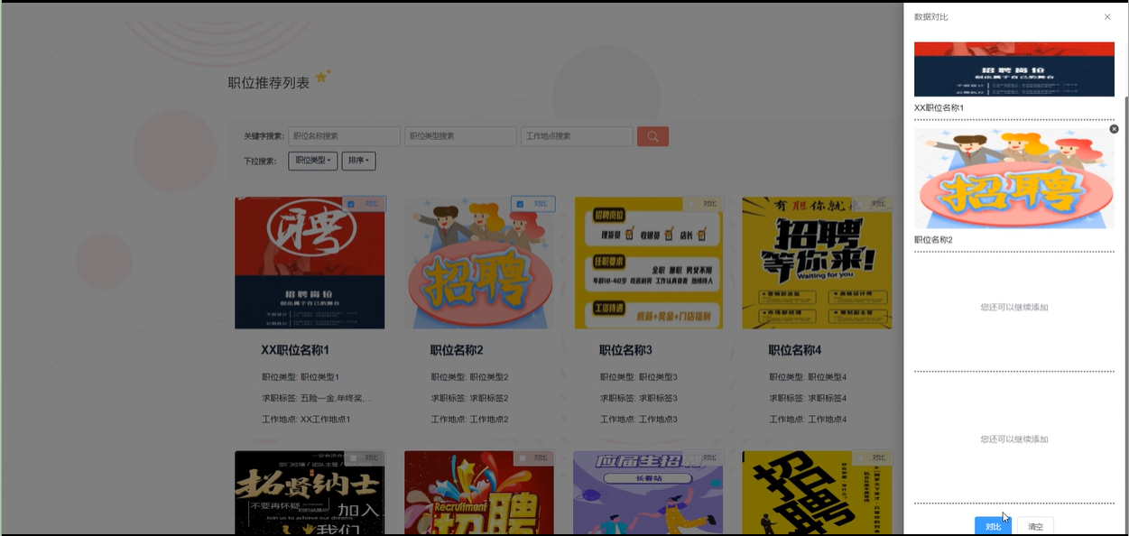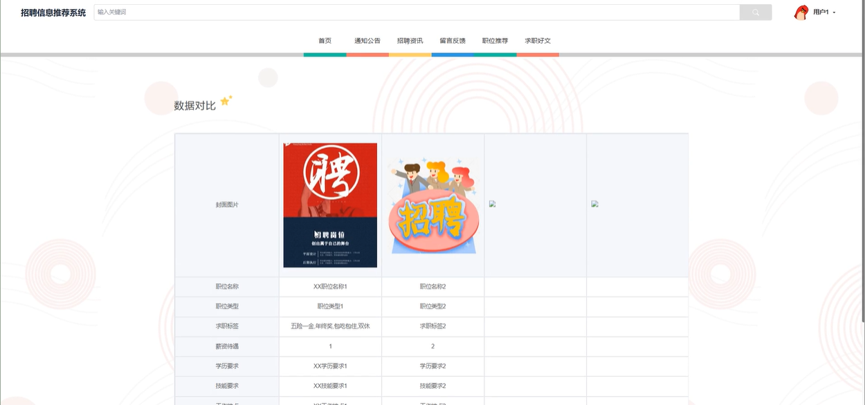 职位推荐:职位推荐功能允许用户查看职位的详细信息,包括职位类型、求职标签、工作地点、学历要求、薪资待遇等。用户可以通过搜索功能快速找到感兴趣的职位,并进行数据对比,帮助做出更合适的选择。此外,用户还可以对职位进行点赞、收藏、评论以及回复,所有操作都支持删除功能。通过系统的智能推荐,职位将根据用户的标签和兴趣进行个性化推送,用户还可以进入职位详情页进行简历投递。