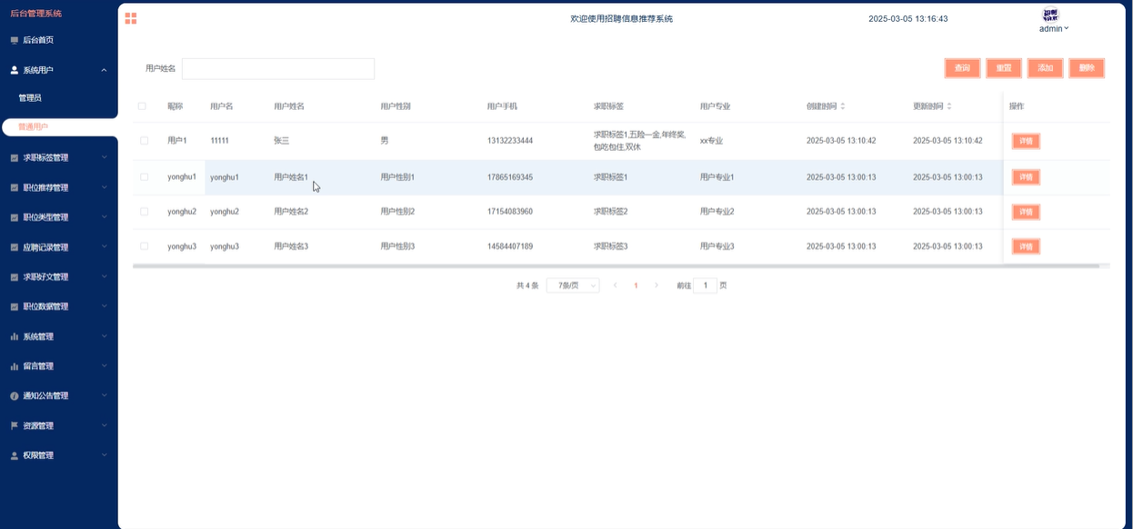 系统用户:管理员可以管理系统中的所有用户,包括普通用户和管理员。管理员可以查看用户的详细信息,并进行搜索、增删改查操作,确保用户信息的准确性和及时更新。