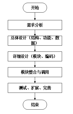 系统开发流程的主要步骤,从需求分析到系统完成的全过程。流程包括需求分析、总体设计(结构、功能、数据)、详细设计(模块、编码)、模块整合与调用,以及测试、扩展和完善,最终完成系统的开发。本系统的开发流程如下图所示