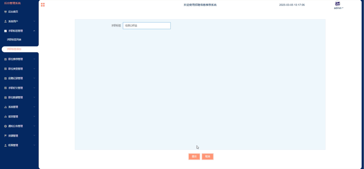 求职标签管理:管理员可以查看、添加、删除和管理求职标签。通过求职标签,系统可以根据用户需求对职位进行更精确的推荐。