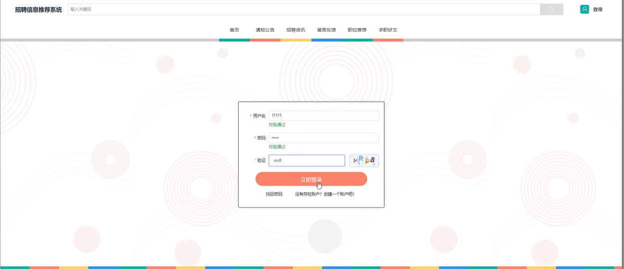 招聘信息推荐系统中的前台上注册后的用户是可以通过自己的用户名+密码进行登录的,当用户输入完整的自己的用户名+密码信息并点击“登录”按钮后,将会首先验证输入的有没有空数据,再次验证输入的用户名+密码和数据库中当前保存的用户信息是否一致,只有在一致后将会登录成功并自动跳转到招聘信息推荐系统的首页中,否则将会提示相应错误信息,登录模块如下图所示。