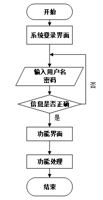 用户首先进入系统登录界面,输入用户名和密码后,系统验证信息是否正确。若验证失败,返回登录界面重新输入,若验证成功,则进入功能界面,执行相应功能处理后结束操作流程。操作流程如下图所示。