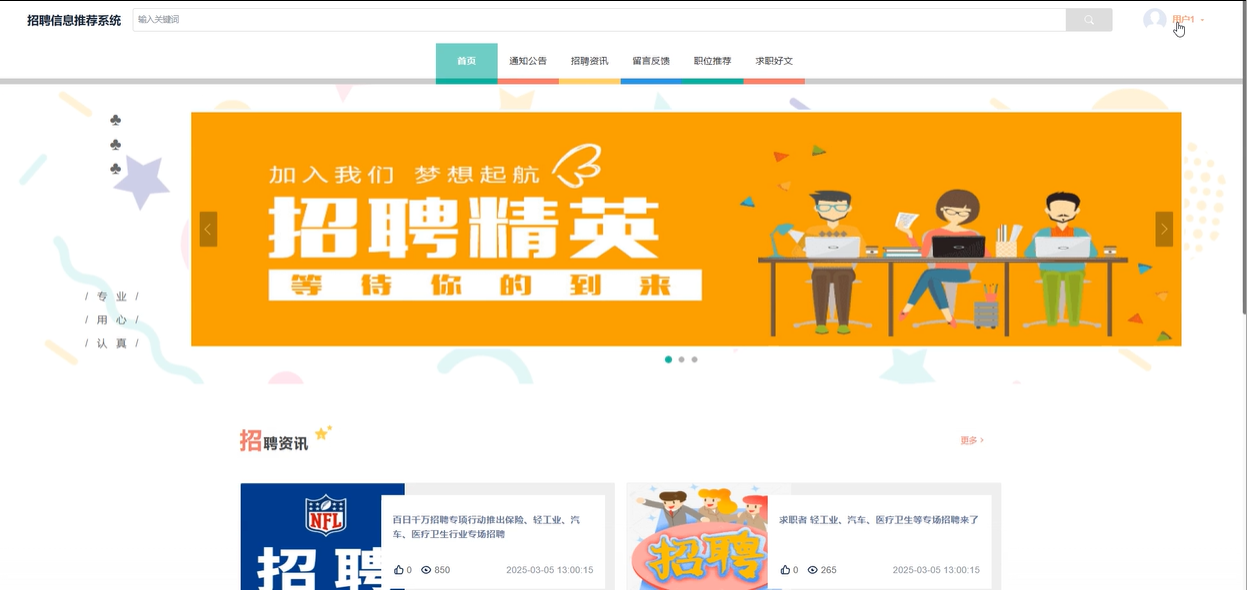 首页:首页提供了网站的基本导航和多样化的内容展示。页面包括轮播图、导航栏、招聘资讯、职位推荐、求职相关好文和搜索框等功能。用户可以在首页快速浏览最新的招聘信息、行业动态,或者进行职位搜索,快速找到感兴趣的岗位。跳转链接可以引导用户进入第三方平台投递简历。