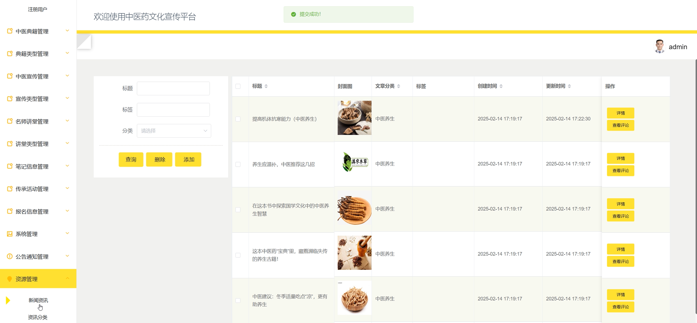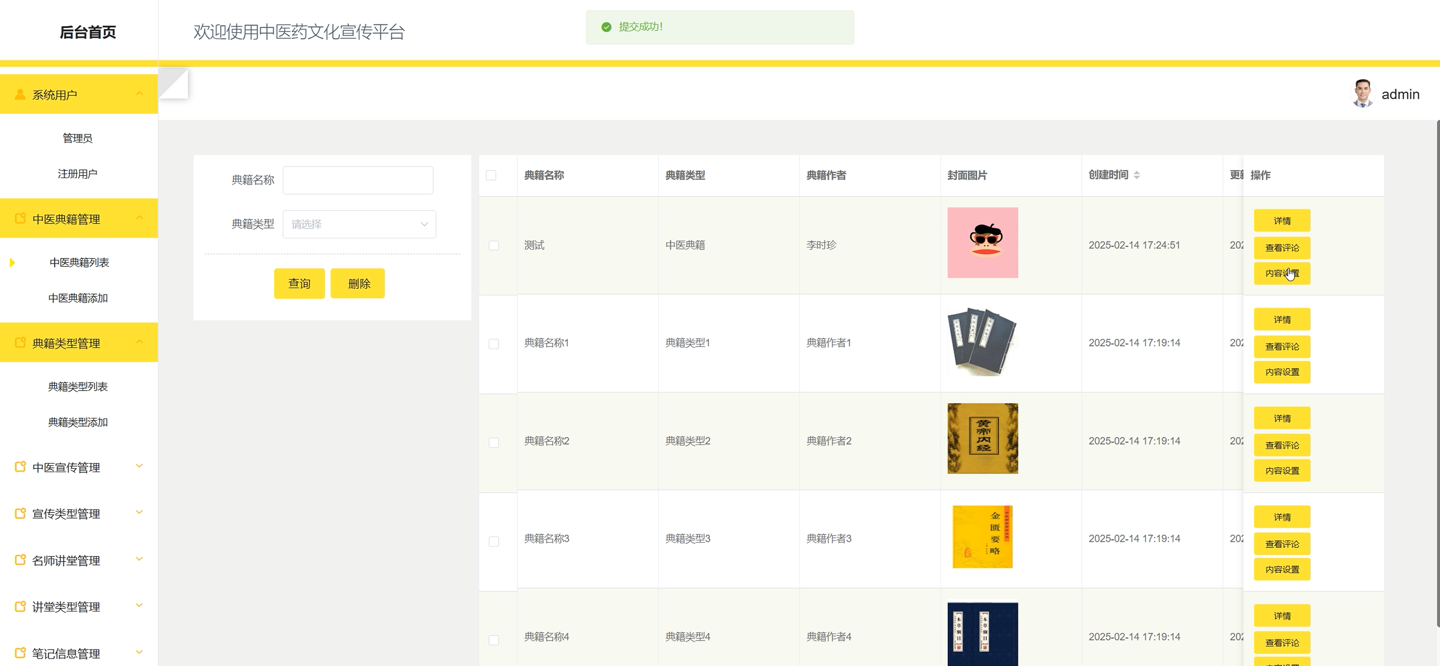 管理员可以查看和管理中医典籍信息,并进行增删改查等操作。其界面如下图所示。