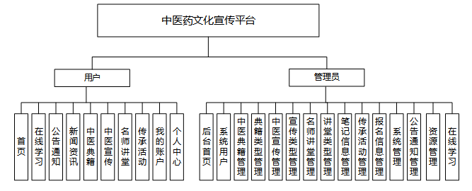 中医药文化宣传平台旨在通过不同角色的功能模块实现对中医药文化宣传平台的全面管理。系统主要分为用户和管理员两大角色,每个角色都有其独特的功能模块,以确保中医药文化宣传平台运营的高效性和透明性。