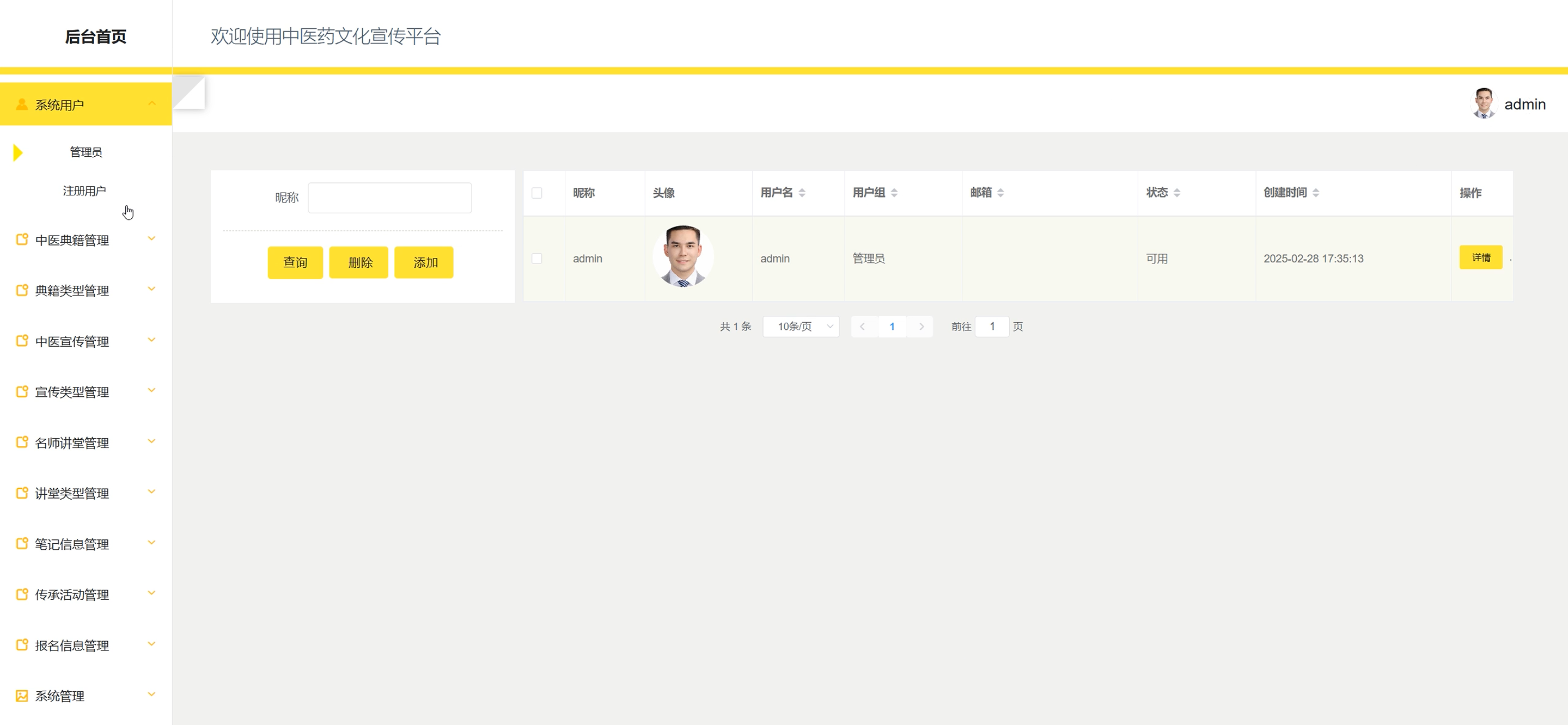 传承活动管理:管理员可以查看和管理中医药文化传承活动信息,管理活动的报名情况,统计参与人数。