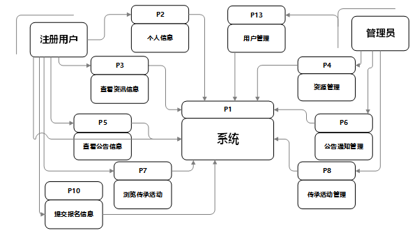 顶层数据流是指系统与外部实体之间的数据流动,描述了系统的整体数据流。在中医药文化宣传平台中,顶层数据流包括管理员录入典籍类型、用户浏览资讯信息、提交报名信息、管理员审核报名信息等。