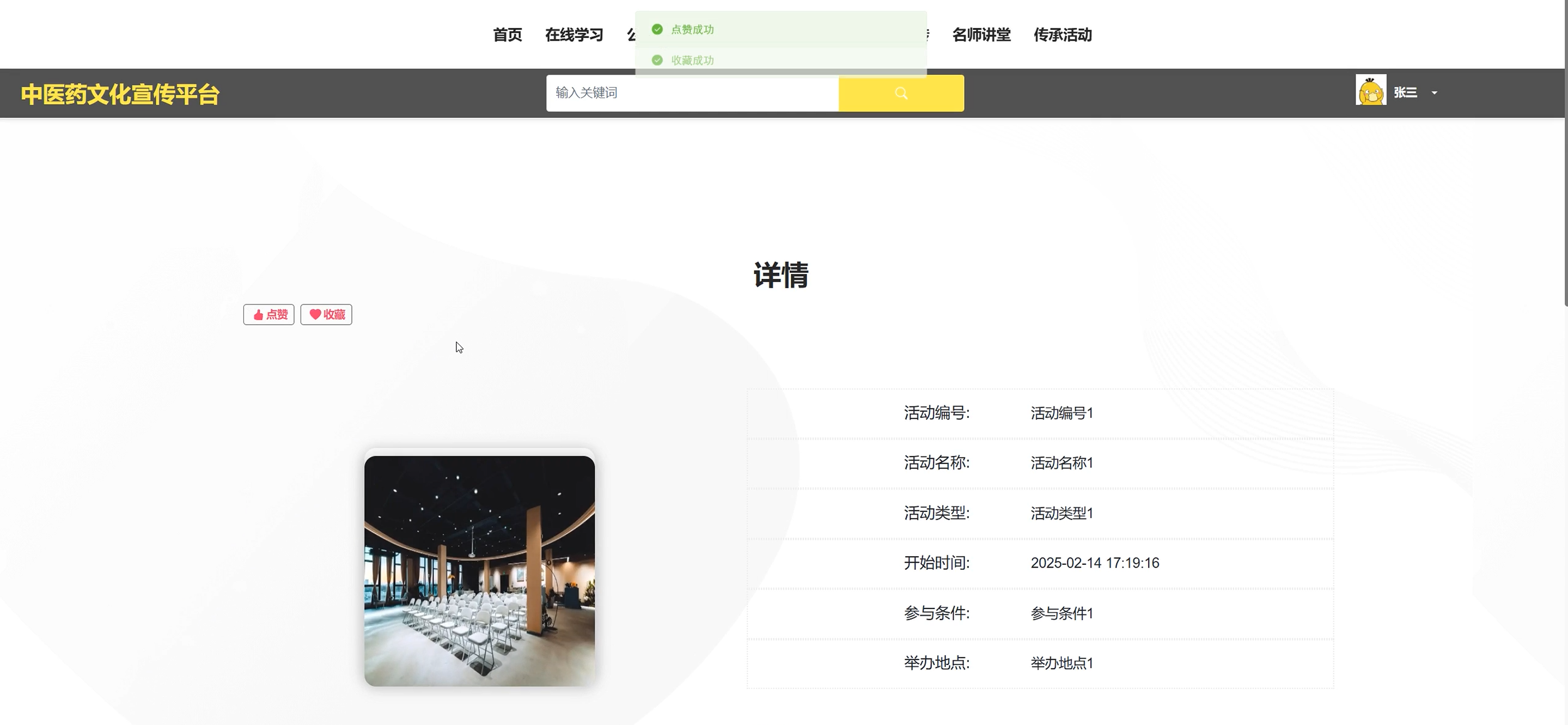 传承活动:展示中医药文化传承相关的线下活动、线上互动活动等,用户可以浏览活动详情、报名参与,并查看活动动态。