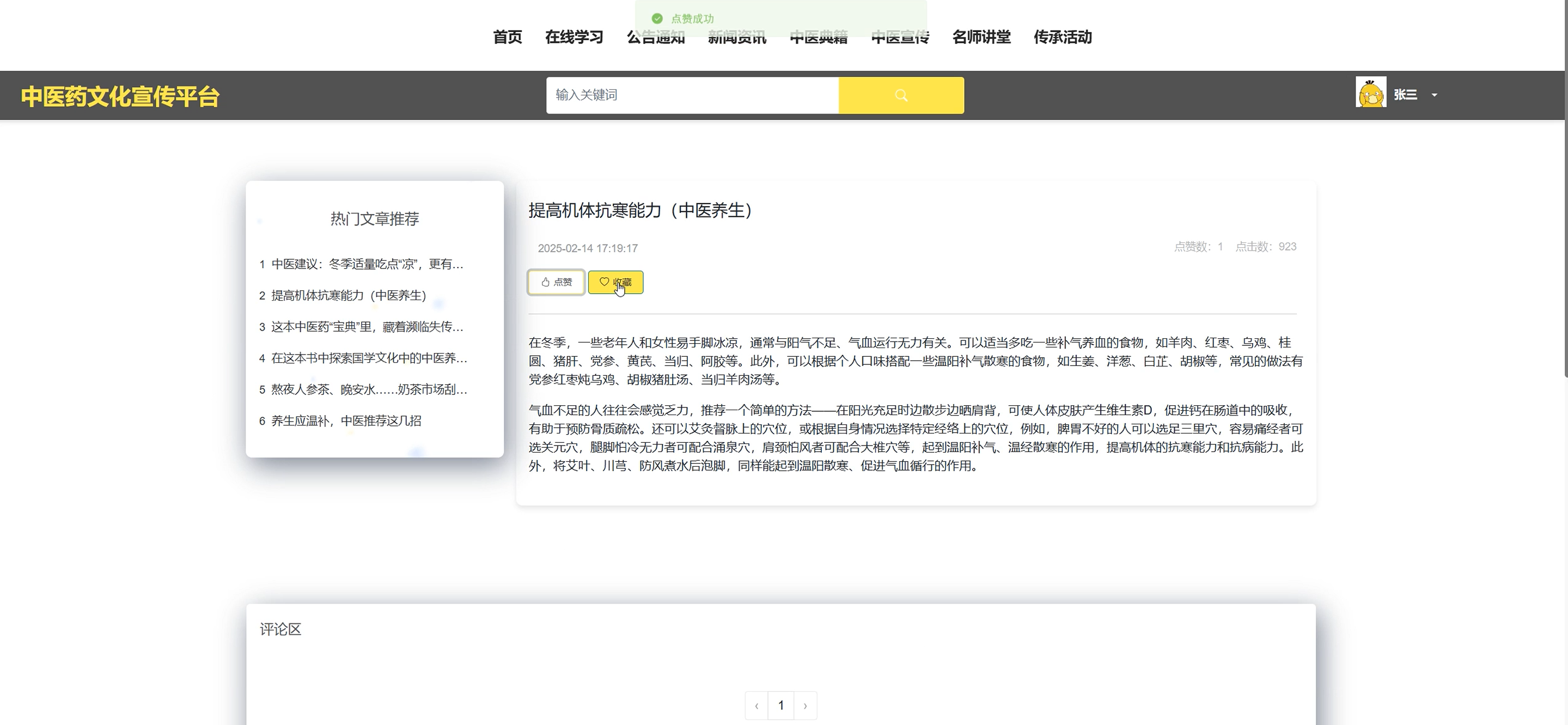 新闻资讯:提供中医药文化的最新动态、行业新闻、科研成果等信息,并进行点赞、评论等操作。