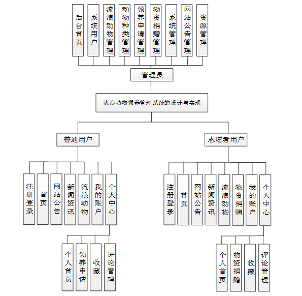 统功能模块包括管理员模块和普通用户、志愿者用户模块,登录进去对应相应的功能。系统功能结构图如图4-1所示。