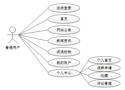 - 用户注册登录:游客可以随时进入到系统中,对系统中的信息浏览,但是想要实现动物领养申请、评论收藏等,就必须有这个系统的账号,如果没有账号的话,可以注册成系统用户进行相关的操作,同时用户还可以对个人信息以及操作的信息进行管控。