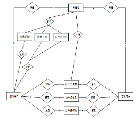 本文在系统分析阶段就抽取了一些实体,根据实体之间的关系,经过分析进行系统E-R图的设计。特色农产品销售系统总体E-R图如下图所示。