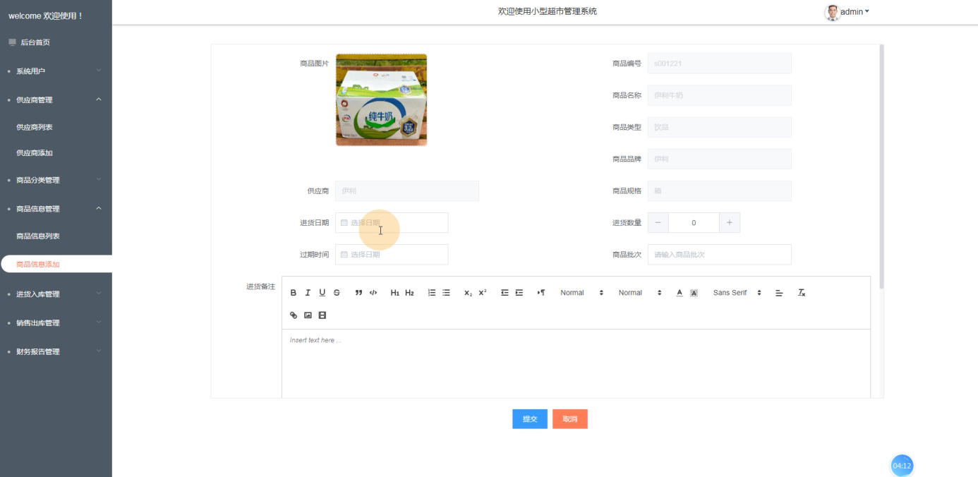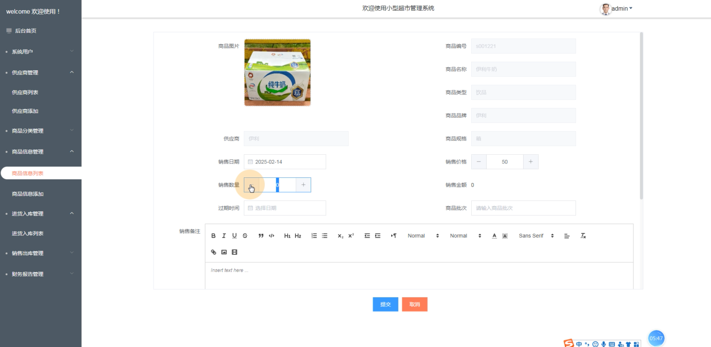 商品信息管理:管理员不仅可以查询商品信息,还能更新库存状态并记录进货入库和销售出库的情况。保障库存数据的实时更新与准确性。