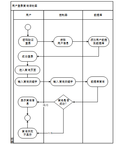 用户注册登录,系统从数据库获取用户数据信息,登录成功用户进入查询页面,用户输入查询关键字,数据库查询用户所输入的关键字,查询成功显示查询的模块信息,查询失败不显示。用户登录查询功能的活动图如图3-3所示。