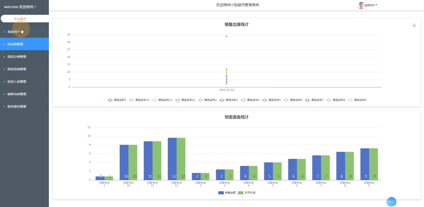 The system implementation mainly covers three core functional modules: first, the background home page for employee users displays sales outbound statistics, supplier inquiry, commodity information inquiry, and purchase warehousing and sales outbound record inquiry; The second is to design a more comprehensive management interface for administrators, including advanced functions such as financial report statistics, system user management, and commodity classification management. The Spring Boot framework is used to simplify the development process, ensure the stability and scalability of the system, and use the MySQL database to store data to ensure the efficiency of data processing.