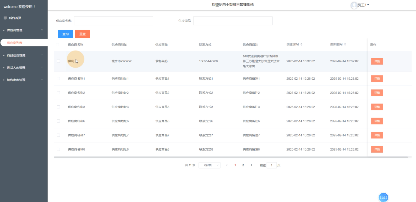 供应商管理:允许员工查询现有供应商的信息,如联系方式和供货记录。支持通过关键字搜索快速定位特定供应商。