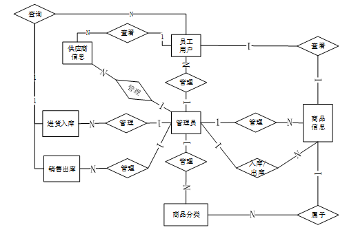 本文在系统分析阶段就抽取了一些实体,根据实体之间的关系,经过分析进行系统E-R图的设计。下面是整个小型超市管理系统中主要的数据库表总E-R实体关系图。