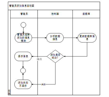 此活动图描述了管理员添加信息。管理员可以通过信息管理模块页面选择要添加的基本信息。添加成功传入数据库中,失败则不添加。管理员可以保存信息并更新系统中的信息。管理员添加信息功能的活动图如图3-4所示。